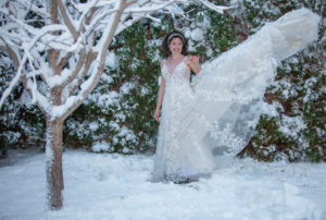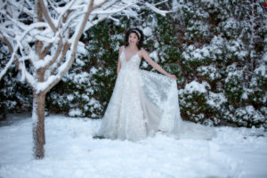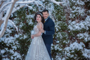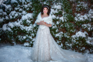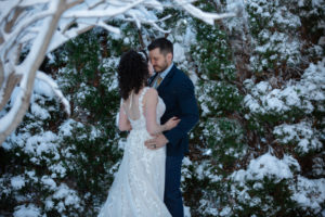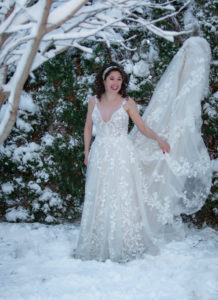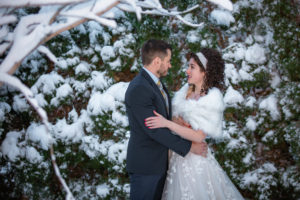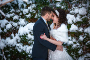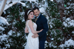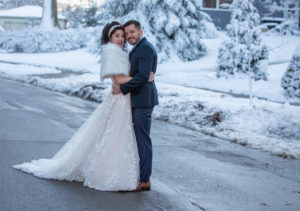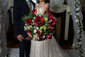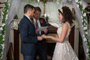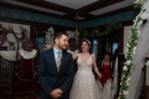 Lizzie and Matthew got married at the home of her parents and her father was the officiant. The living room was set up like a chapel, the bride walked down the stairs from the second floor to greet her groom. They got married before a small number of family and friends. Then they enjoyed dinner in the dining room.